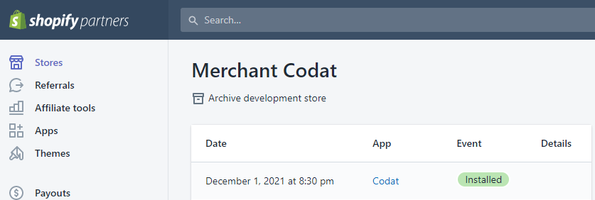 When the LinkLink The authorization flow that allows end users to connect their accounting, banking, or commerce platforms to your application via Codat. flow is complete, your Development Store opens and your app is automatically installed into the Store.