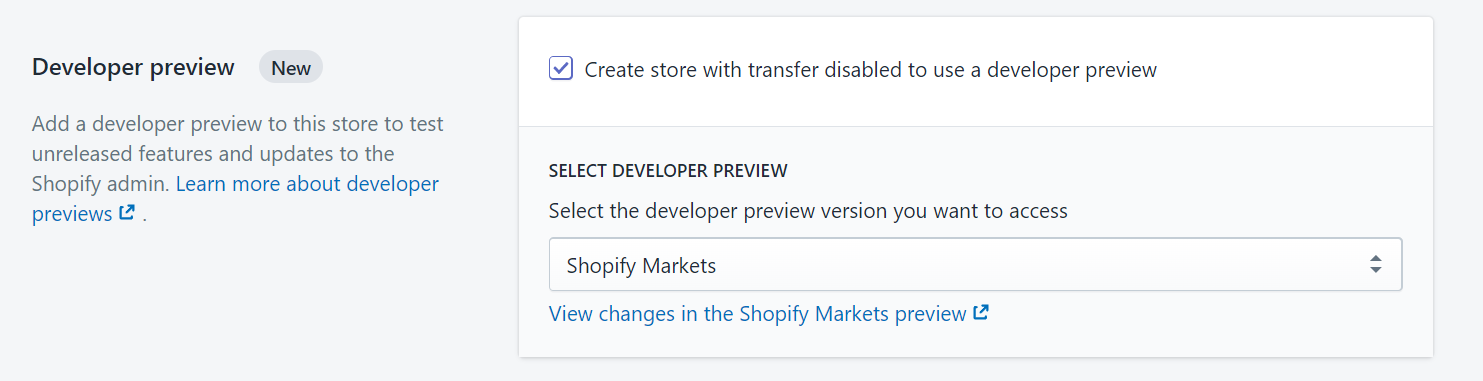 Ensure the Create store with transfer disabled to use a developer preview checkbox is selected, and then choose Shopify Markets from the dropdown list: